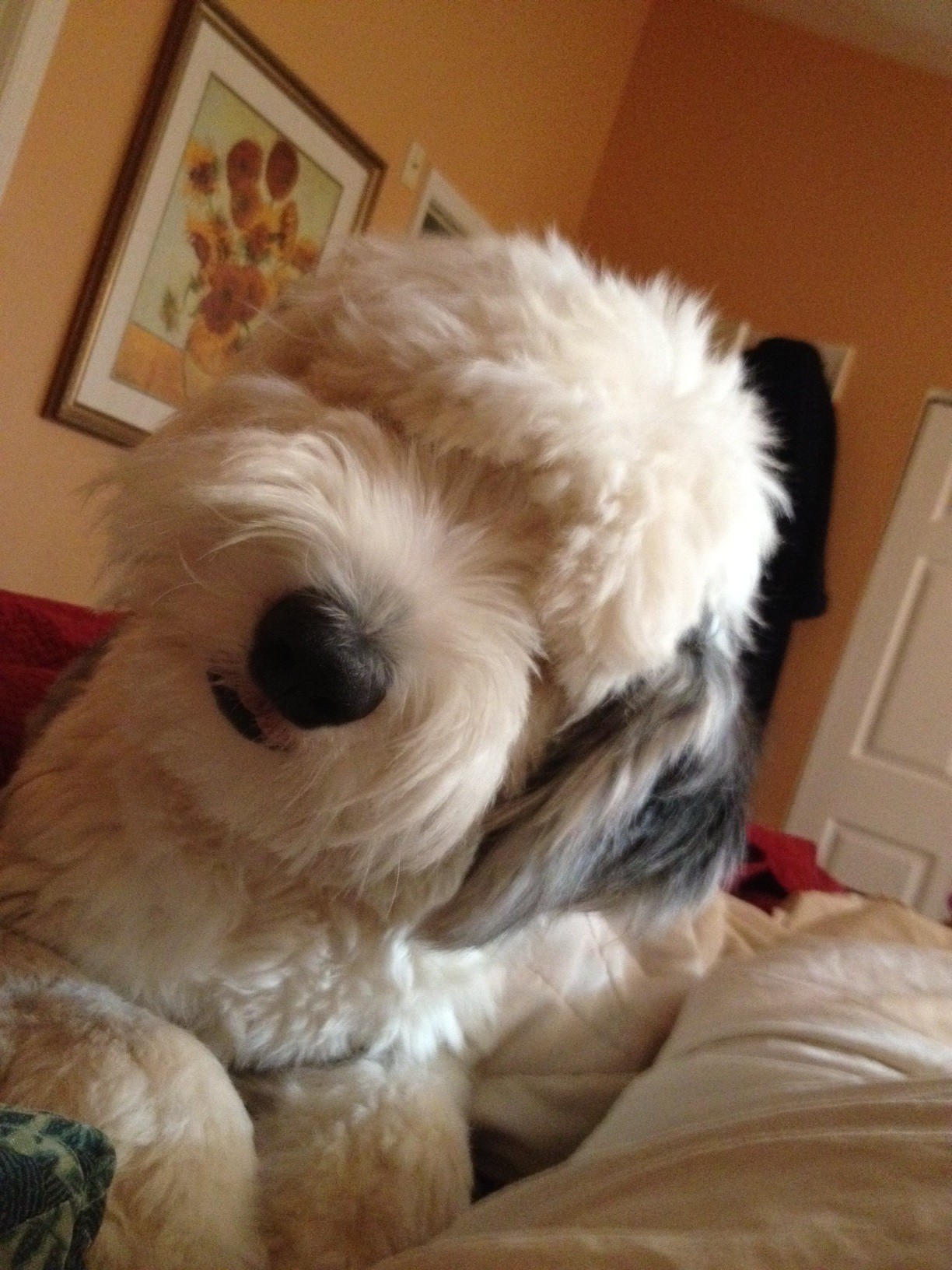 Ok, so I have nothing to post about. My wife has my Macbook Air and will have it for the next month or so, and I hate writing on anything OTHER than my Macbook Air, so I’m not doing any writing. This sorry excuse will only last so long. I hope to begin the next project soon. Meanwhile, meet Peekabu, my Old English Sheepdog!